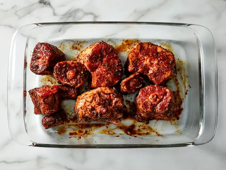 1. Place oxtail in a shallow dish. Combine soy sauce, Worcestershire sauce, salt, sugar, garlic and herb seasoning, browning sauce, paprika, cayenne pepper, and black pepper together in a small bowl. Rub both sides of oxtail with soy sauce mixture; discard any excess.